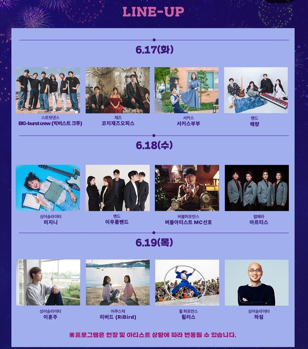 - 6.17~6.19: BIG-burst crew, 밴드 해랑, 미지니, 버블아티스트 MC선호, 아티리스, 하림 등