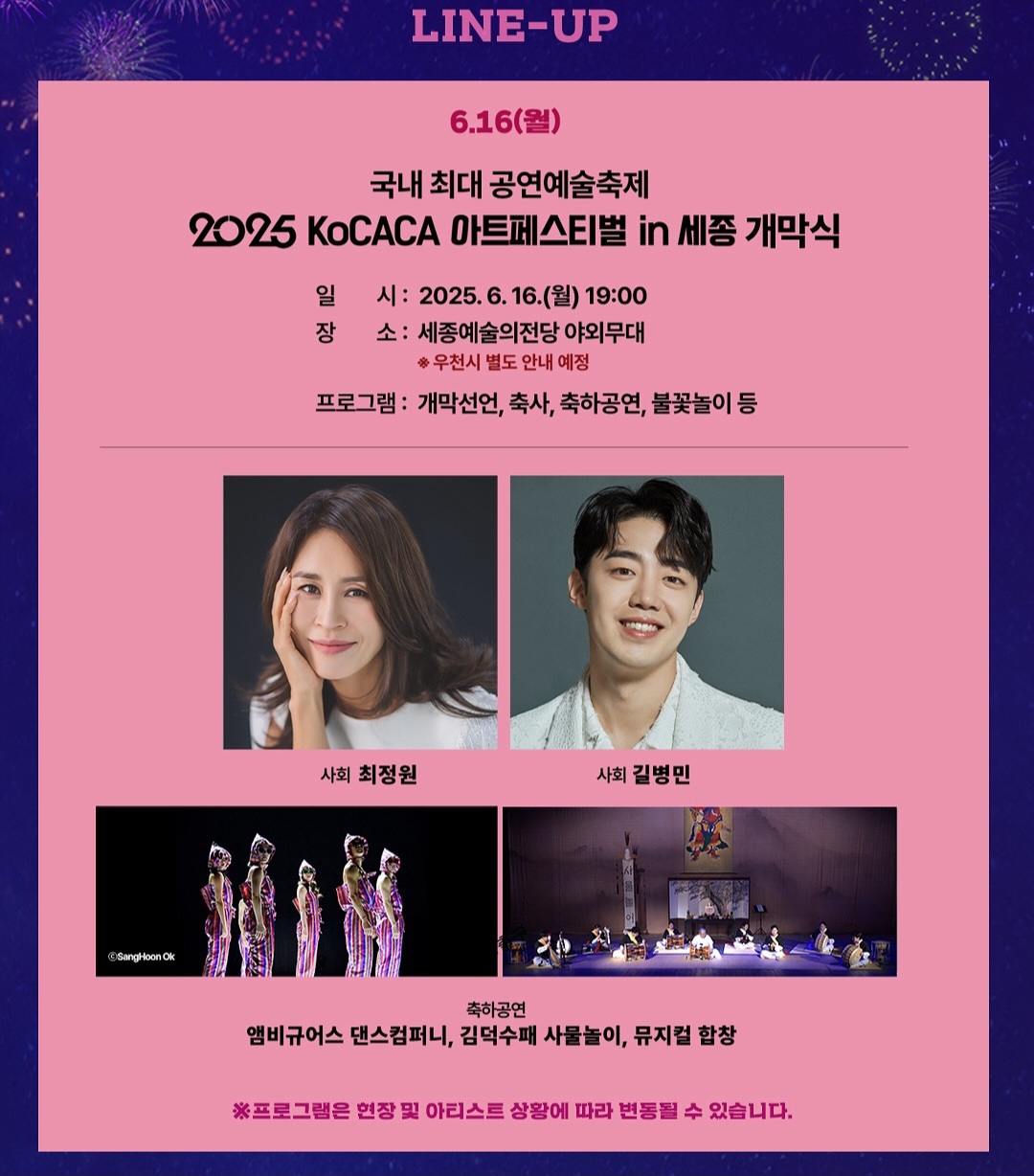 - 6.16 (월): 개막식 (사회: 최정원·김병민), 불꽃놀이, 전통 공연 등