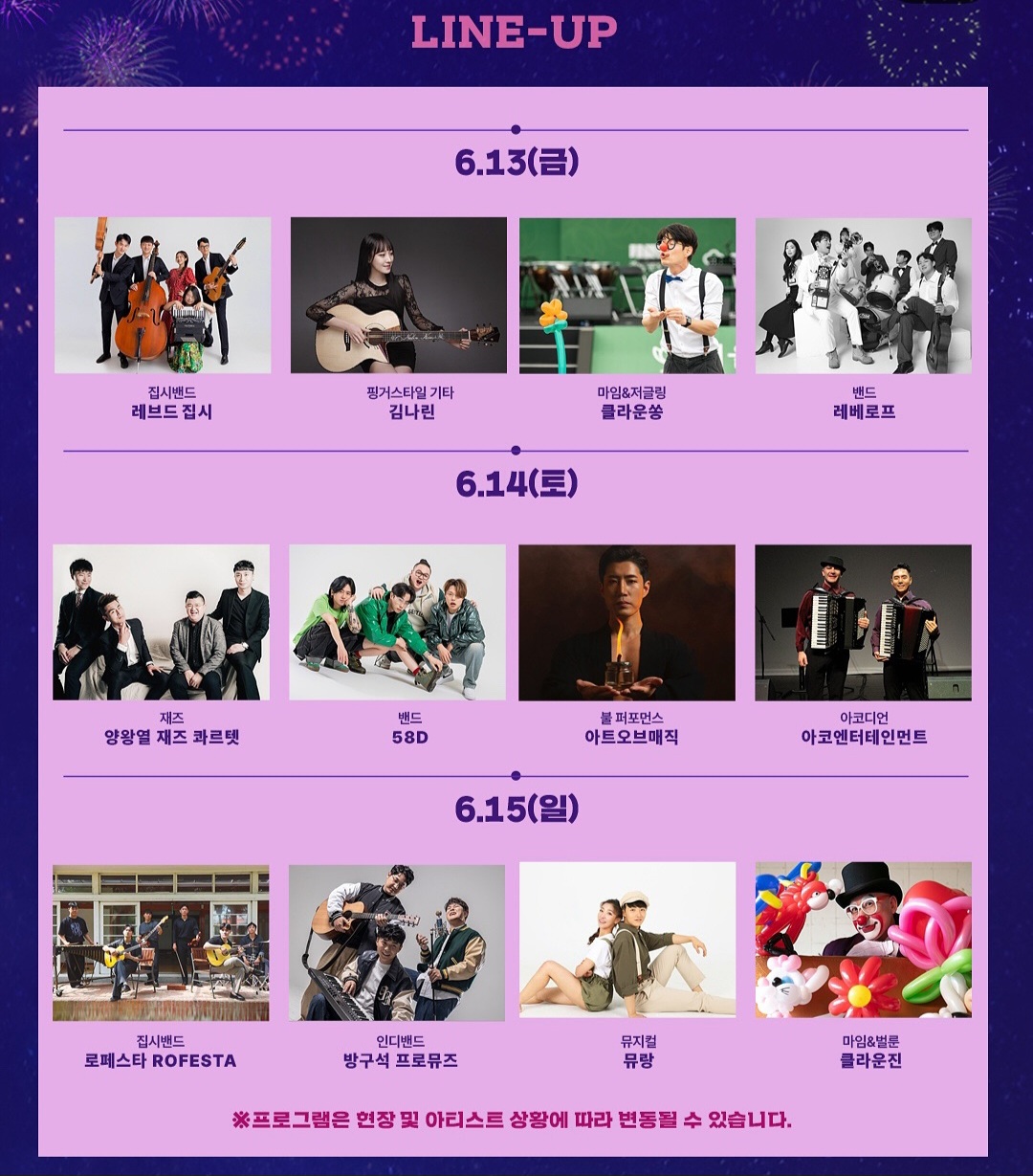 - 6.15 (일): 집시밴드 ROFESTA, 인디밴드 방구석 프로뮤즈, 뮤지컬 ‘뮤향’, 클라운진